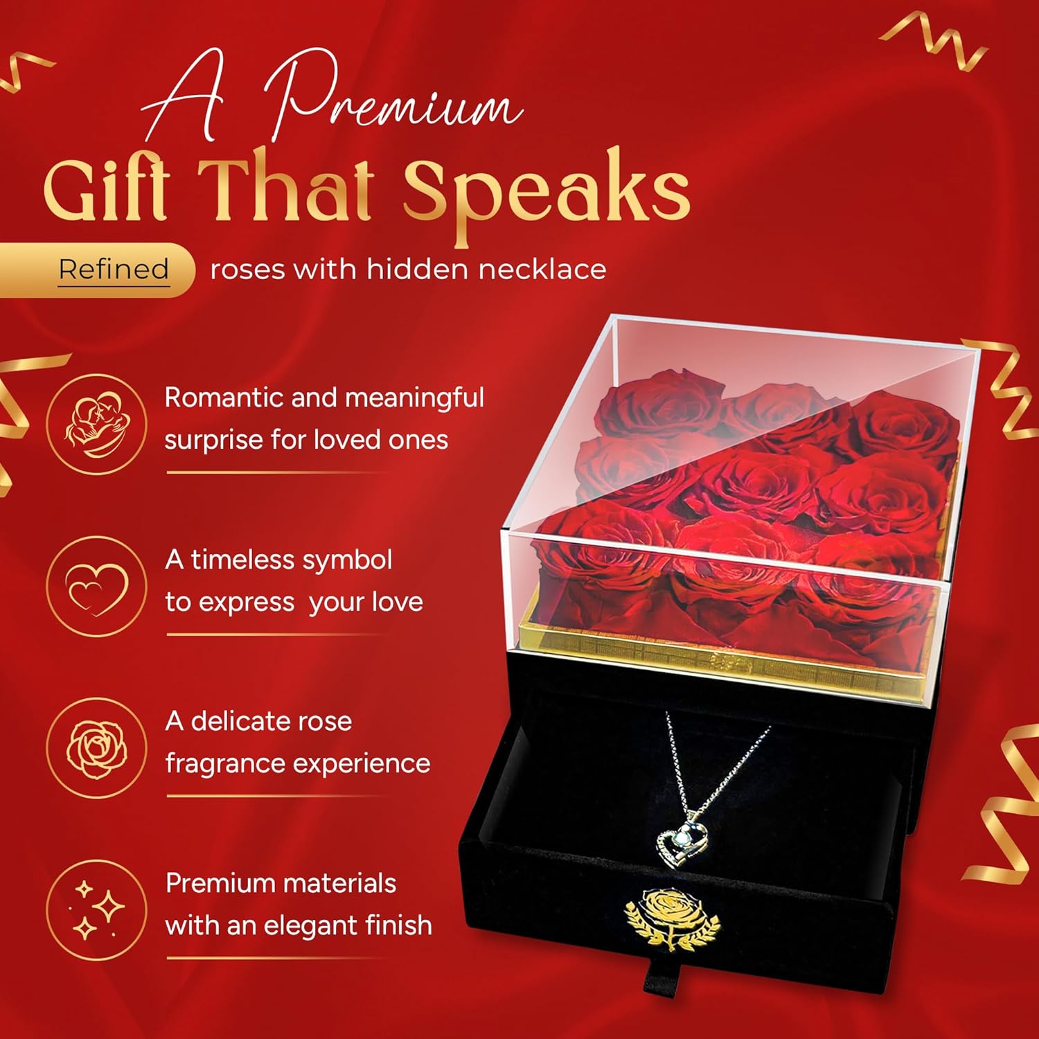 - Real preserved roses: Long-lasting roses designed to stay beautiful for 3+ years.